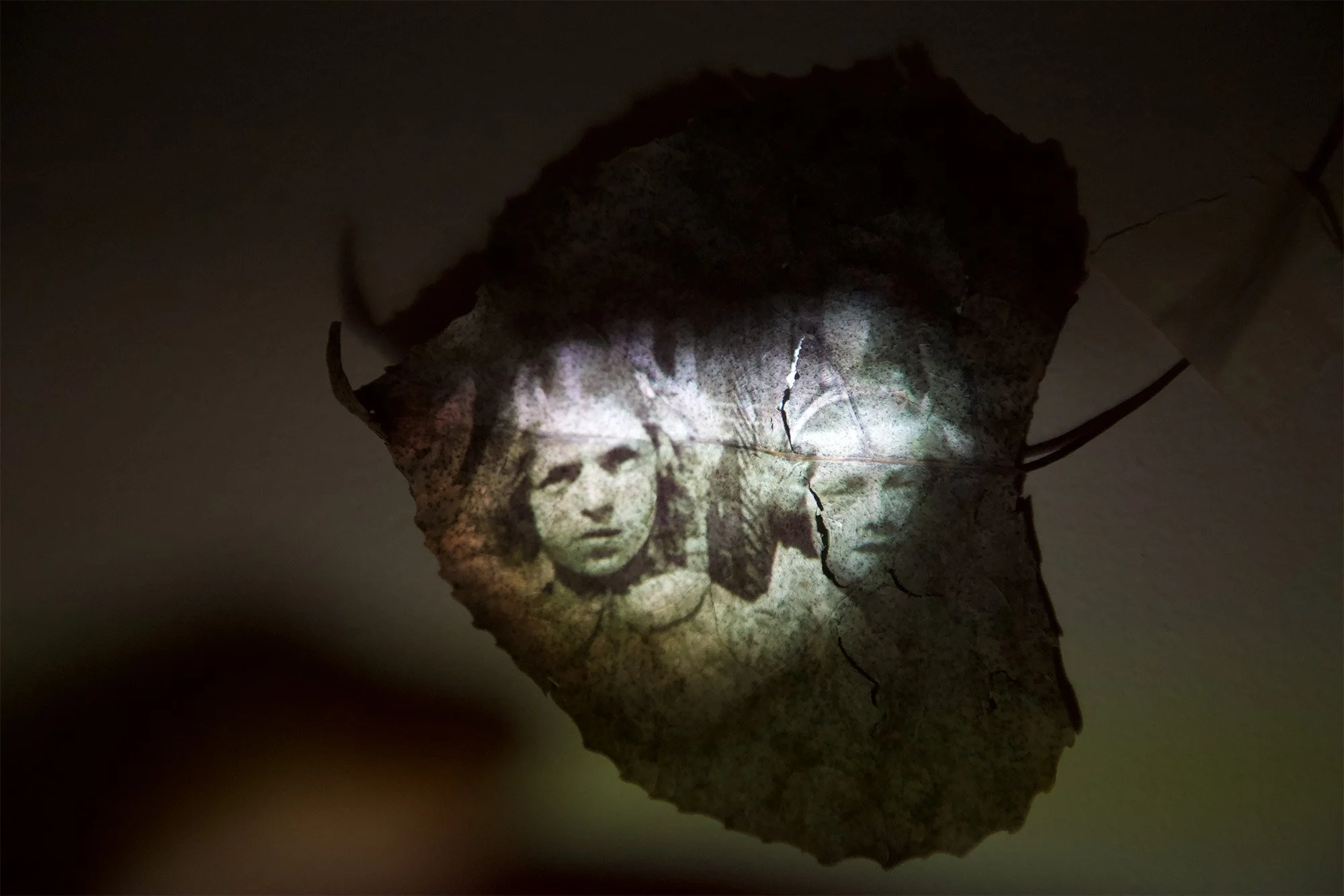 The Cosmic Tree represents all beings in the Universe. Trees and leaves have deep symbolism in every culture and are often thought to be the home of spirits. Throughout my life I have connected with the magical within the refuge of the forest. As a soothing ritual during these times I began collecting leaves, bringing them back to my home and projecting old photographs of my family using the light of the projector as a lens into the past. The fragility of the leaf conveys the ephemeral nature of memory and life energy. Through these projections I saw an alchemical process occurring between the image and the leaf which brought forth unforeseen nuances of mystery and emotion.